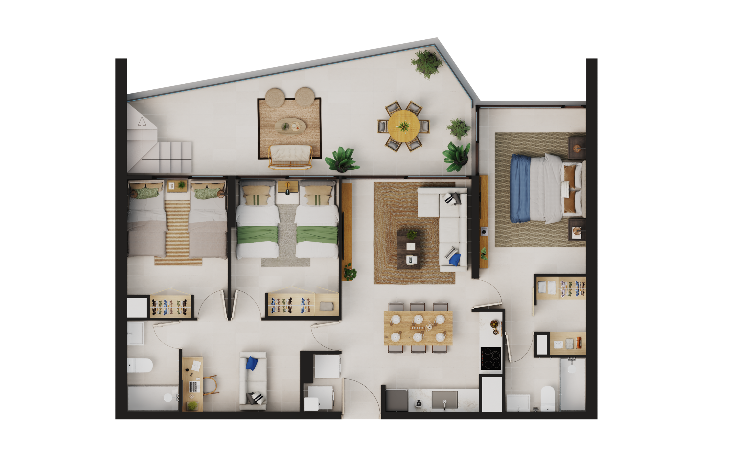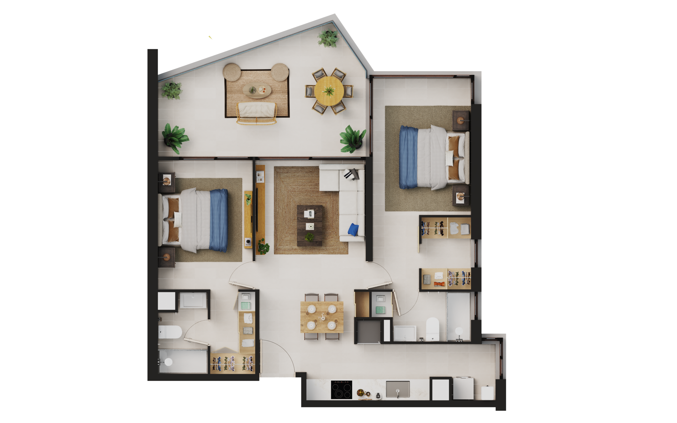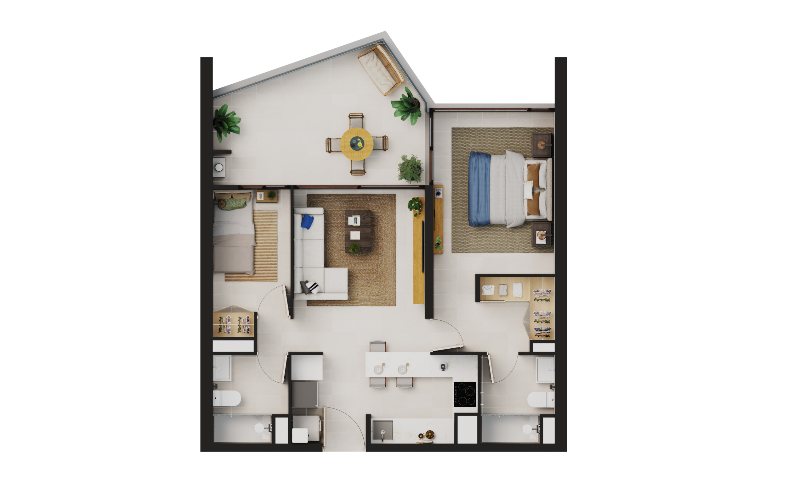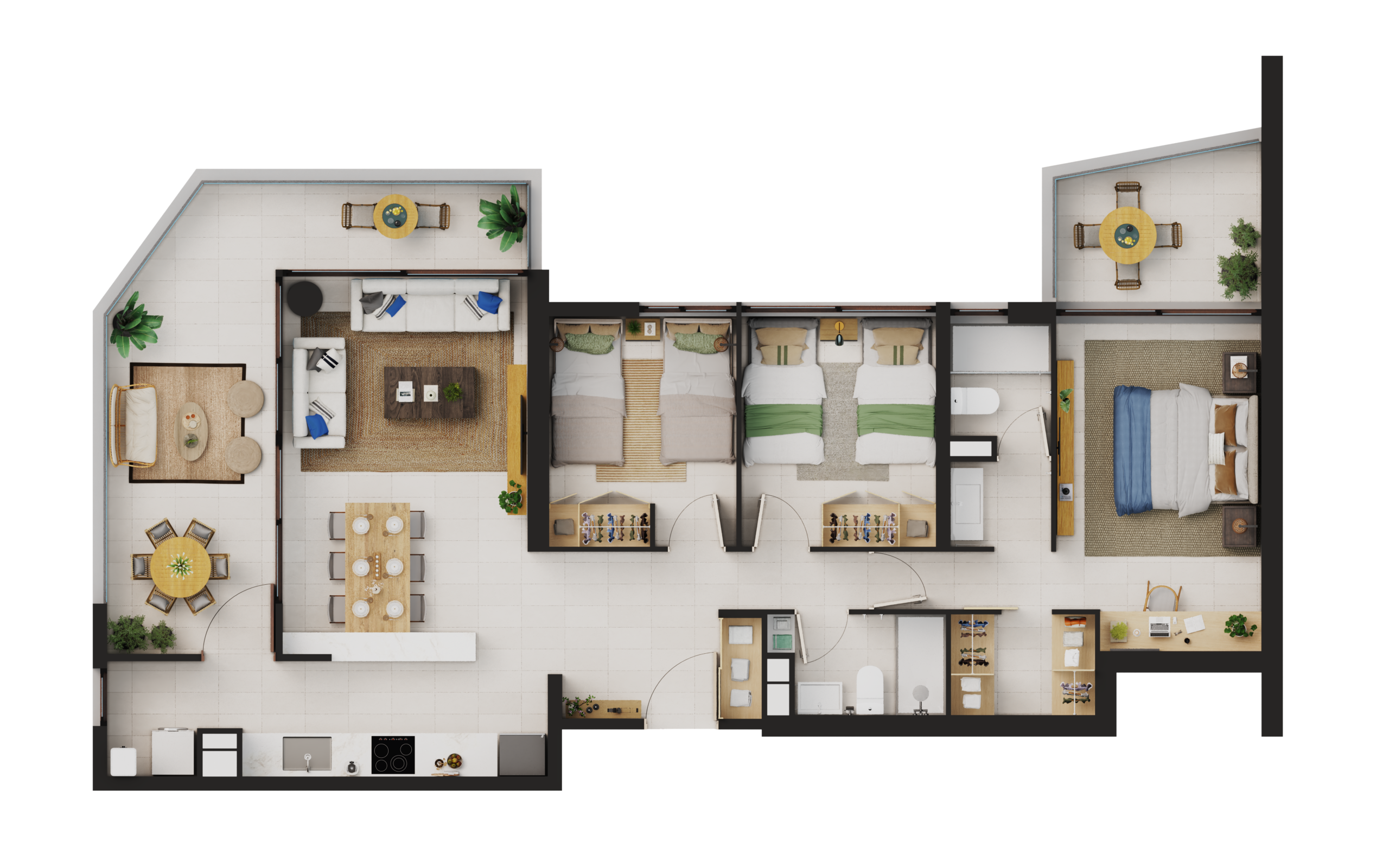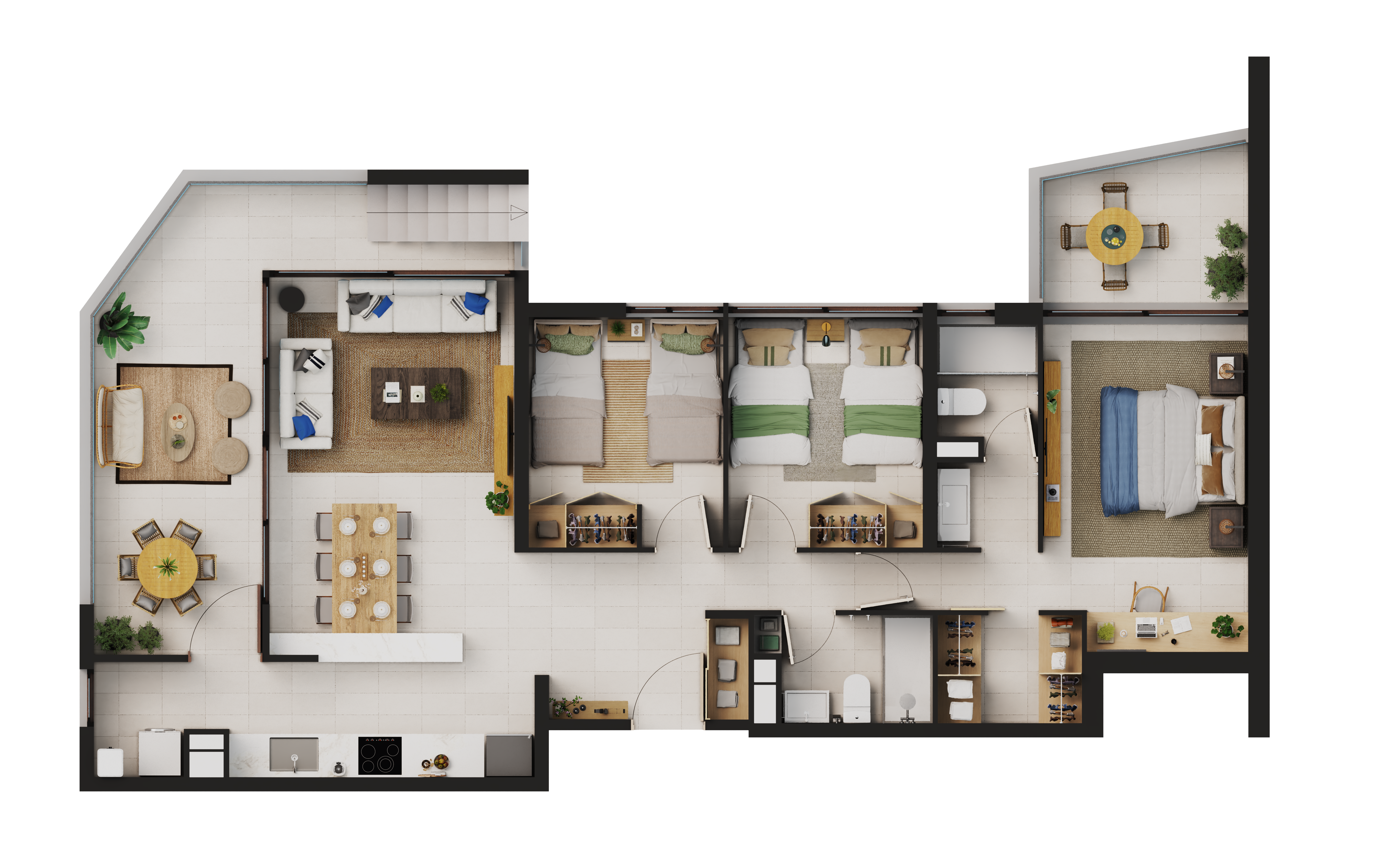 - Cocinas equipadas con cubierta de Porcelanato, encimera vitrocerámica, horno eléctrico, microondas empotrado y campana retráctil.