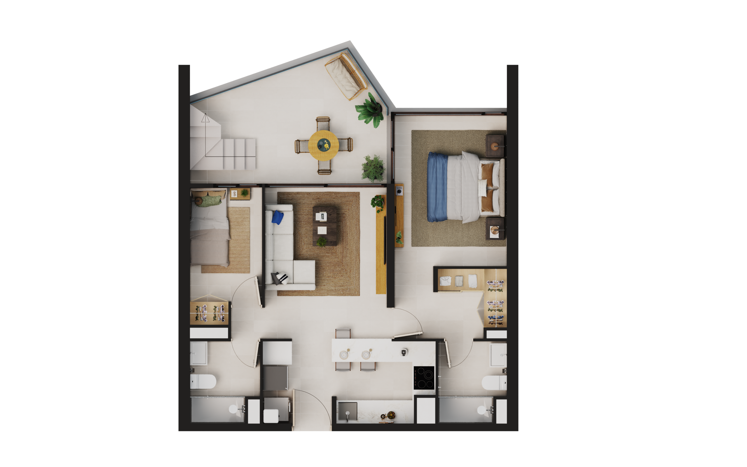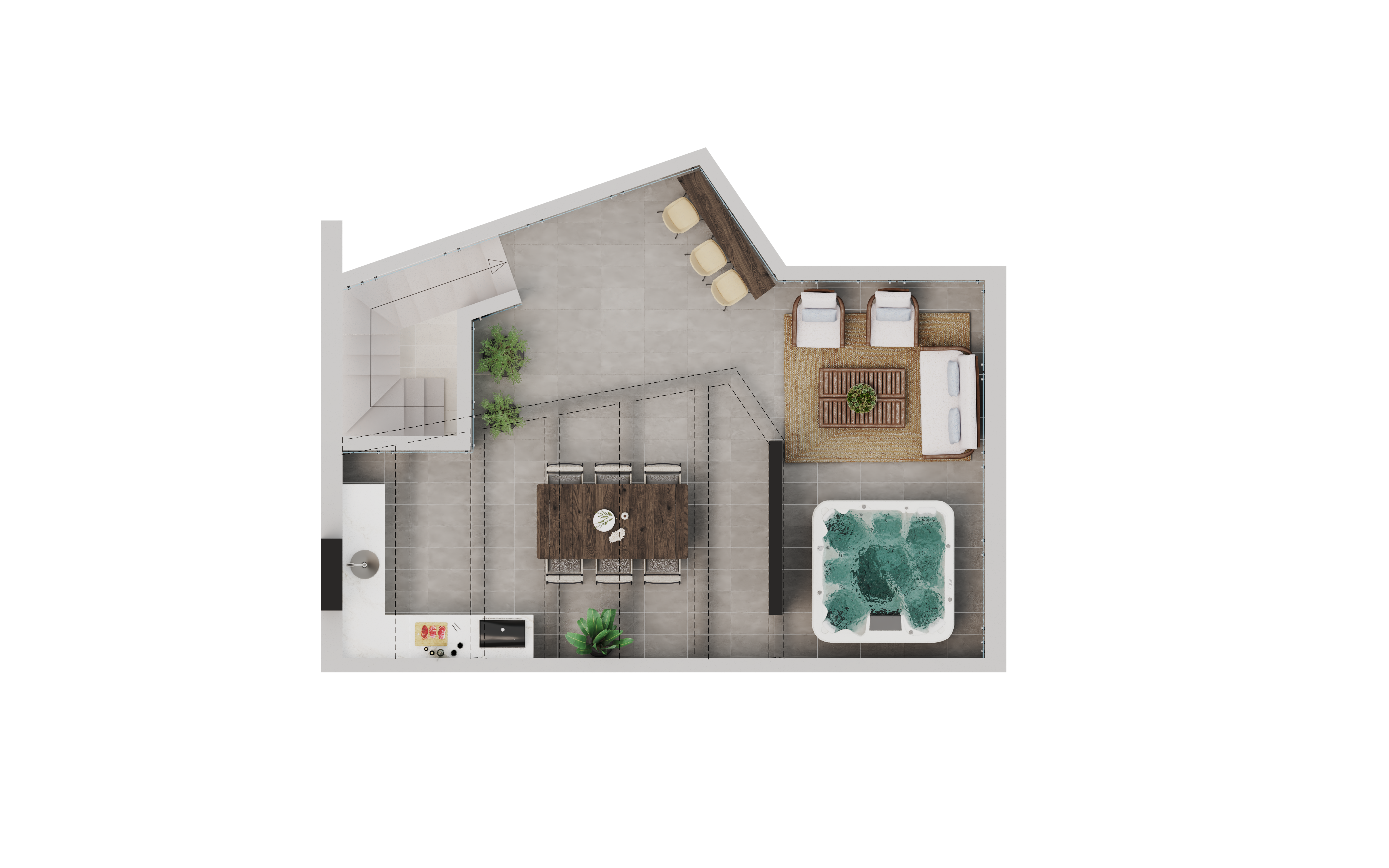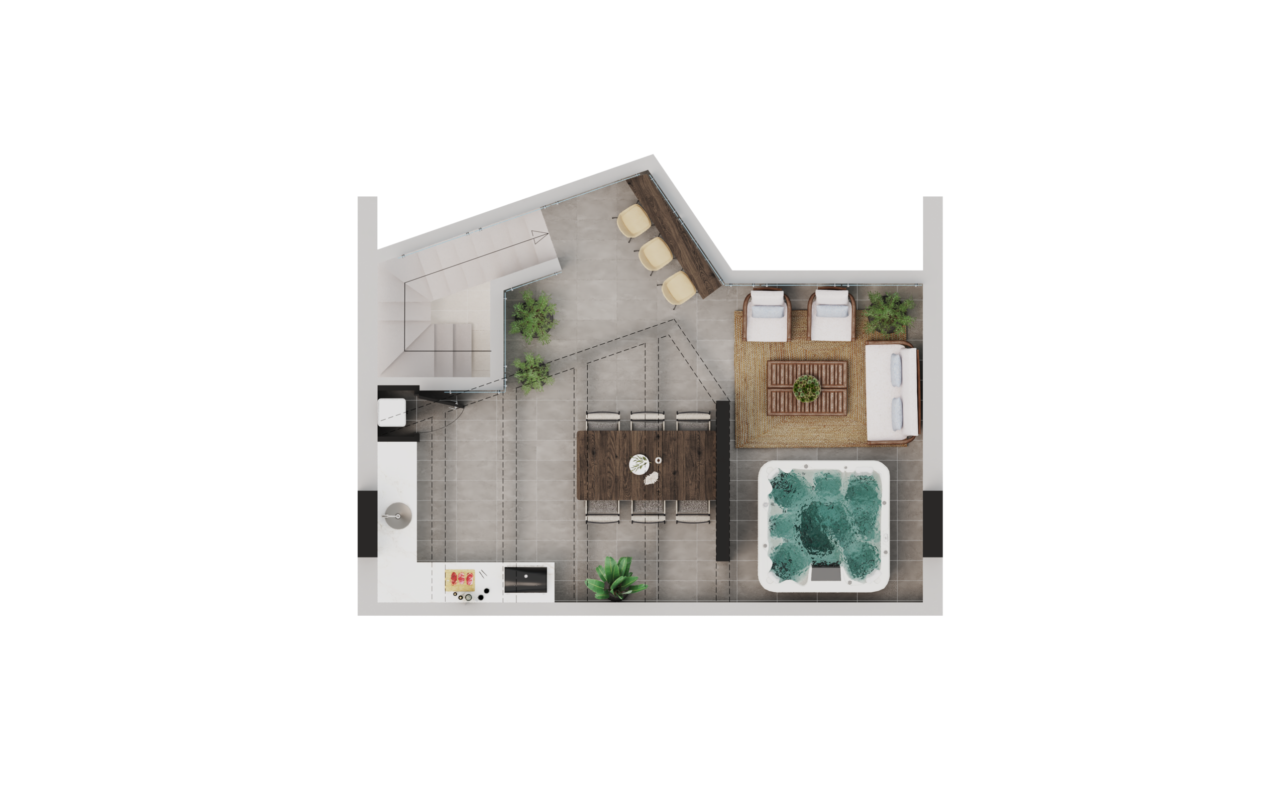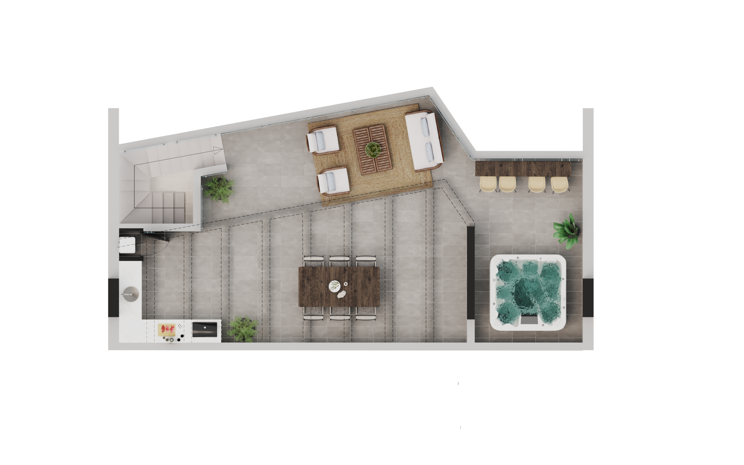 - 7 exclusivos penthouses con terraza privada en la cubierta del edificio. Equipadas con parrilla, conexión para parrilla a gas, lavacopas y tina de hidromasaje.