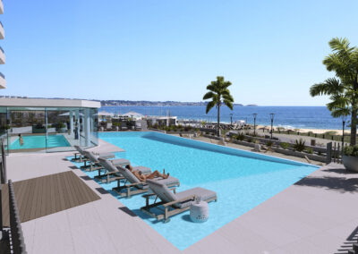 - Piscina exterior para adultos con efecto infinito, sector de reposeras y vista directa al mar.